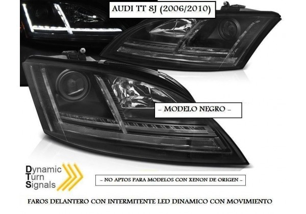 Juego de Faros delanteros con Intermitente LEDs Dinamico (Con Movimiento) para AUDI TT (8J). Año de Fabricacion: 2006 al 2010. Diseño Negro. Faros con Tecnologia Fibra Optica en Luz de Posicionamiento. Con With Dynamic Turn Signal (Intermitentes LEDs con Movimiento Dinamico). Compatible con Ordenador de a Bordo. Facil y sencillo montaje (Plug And Play. Conectar y Listo). No compatibles para vehiculos con Xenon de Origen. Sustituye los Faros de Origen. No requieren ninguna modificacion. Precio por Juego de Faros (Izquierdo + Derecho). ILUMINACION:. Luz de Posicionamiento: LED. Intermitente LED Dinamico (Con Movimiento). Haz de luz: H7. Viga alta: H1. Regulacion Electrica (Debe instalarse el motor de origen). Homologado. Consultar disponibilidad o dudas llamando al 946403645 / 636094879 (tambien por whatsapp) o haciendo click en ¿Preguntas?. El tiempo de entrega puede ser de 2 a 15 dias hábiles.
